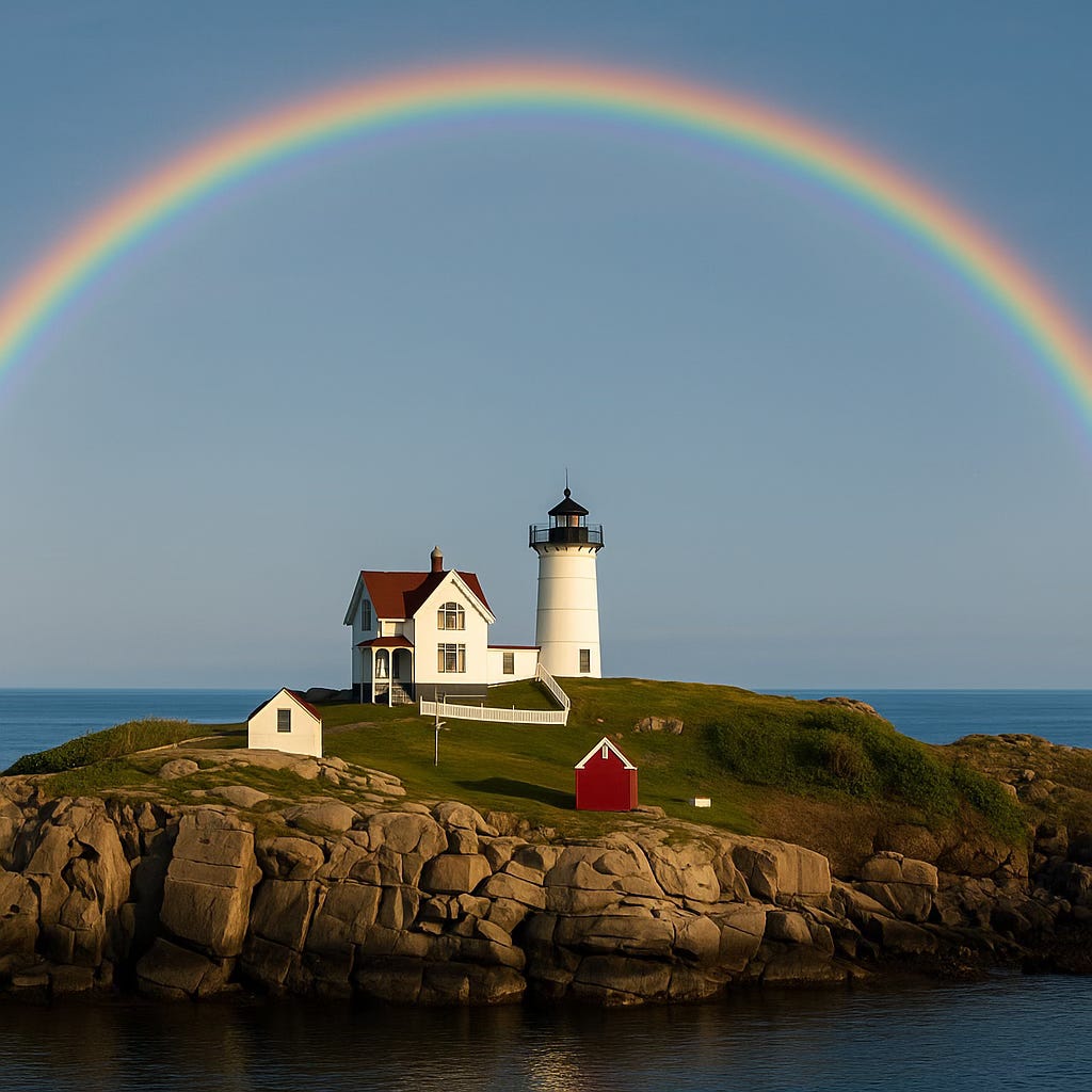 Then I wondered how it would look with a rainbow. I just attached the Nubble Lighthouse photo to ChatGPT and asked it to add a rainbow. The first result was a partial rainbow. So I tried again, asking for a complete rainbow. Pretty impressive!