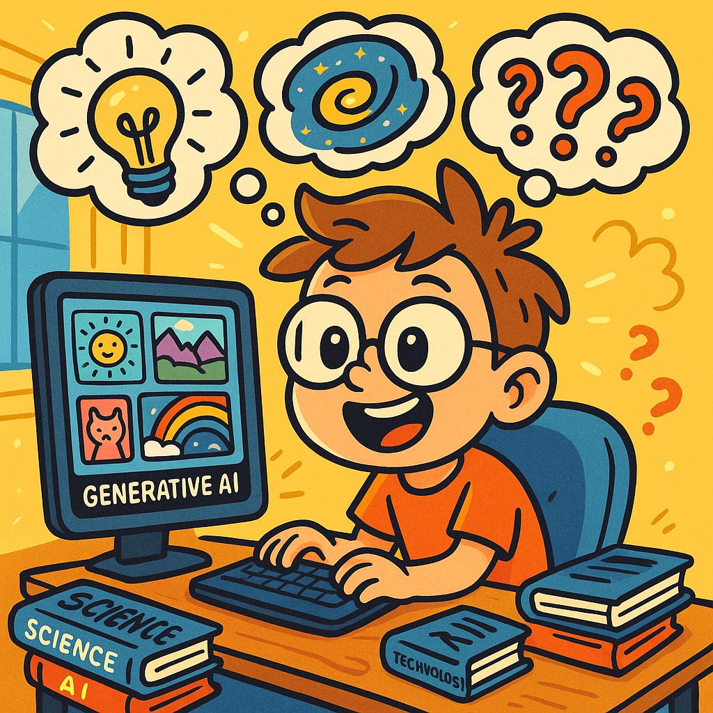 Create a cheerful cartoon character sitting at a computer desk, eyes wide with curiosity. The computer screen glows, displaying colorful AI-generated images and text. Books about science and technology are scattered around. The room is bright and playful, with thought bubbles above the character’s head showing imaginative ideas and question marks. The overall atmosphere is fun, creative, and shows the excitement of discovering new things with generative AI.