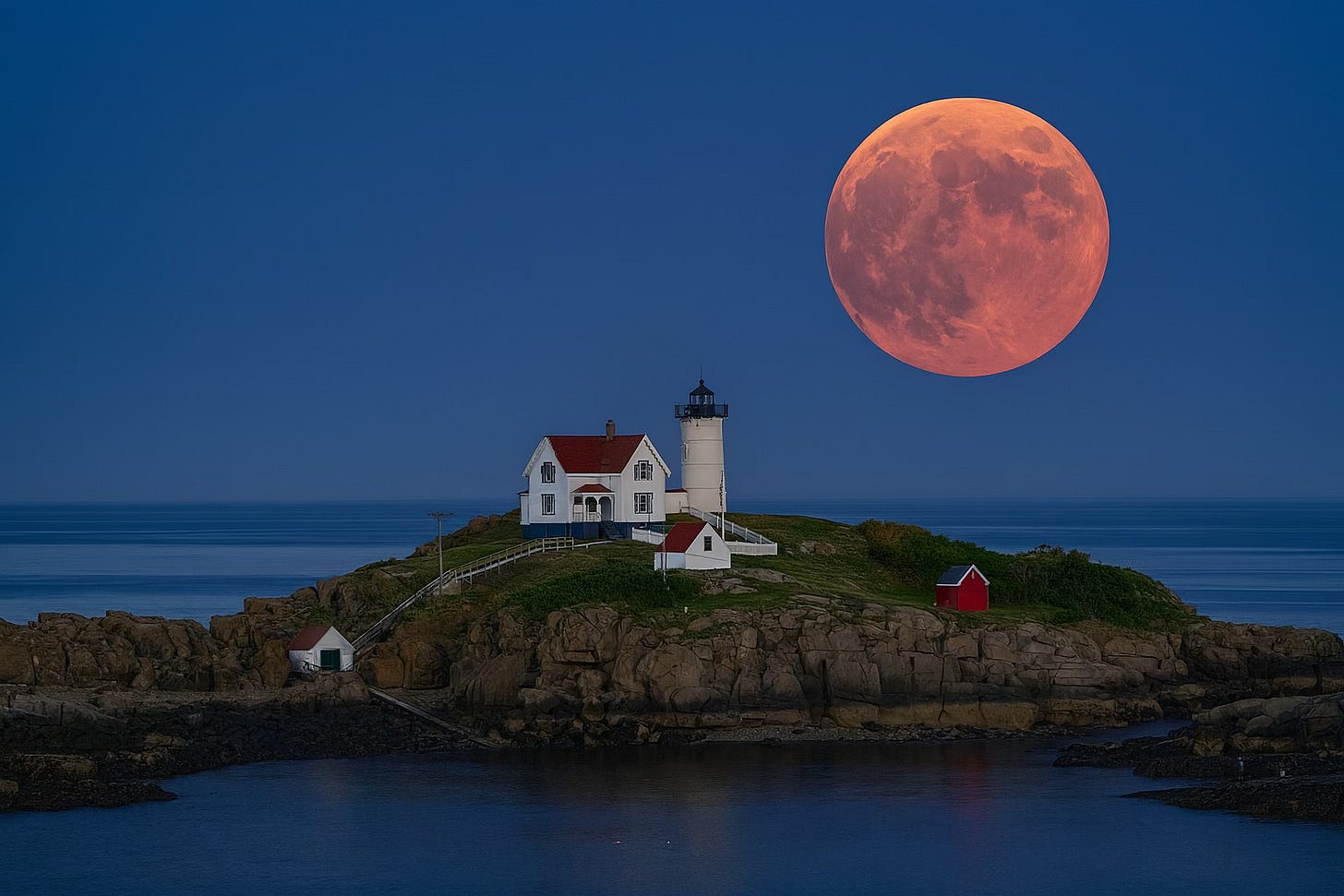 Equally impressive. Now, I imagined a giant full red moon over the lighthouse. ChatGPT automatically darkened the sky to make it more suitable for the scene with a moon.