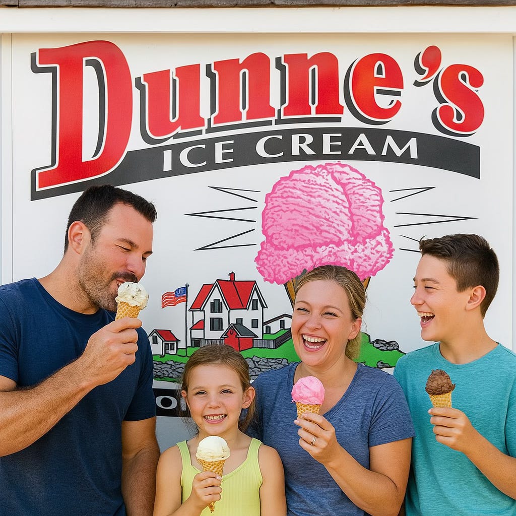 You can also utilize generative AI to create effective advertising and marketing materials quickly. In the following example for Dunne’s Ice Cream, I attached a picture of a sign to use as background and asked ChatGPT to create a photo of a happy family eating ice cream cones in front of it.