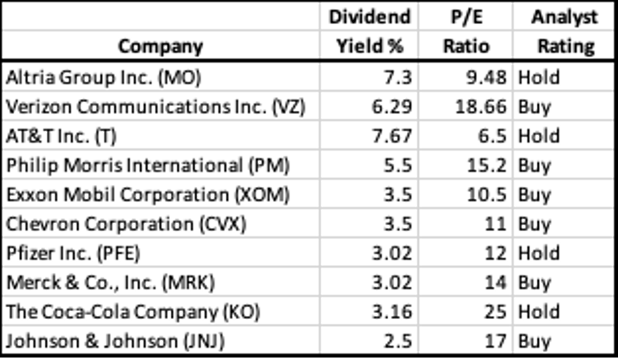 List the ten highest dividend stocks on the Fortune 500, with their P/E ratio and analyst ratings.